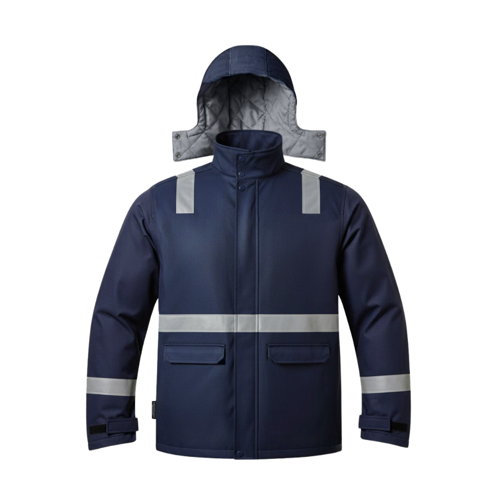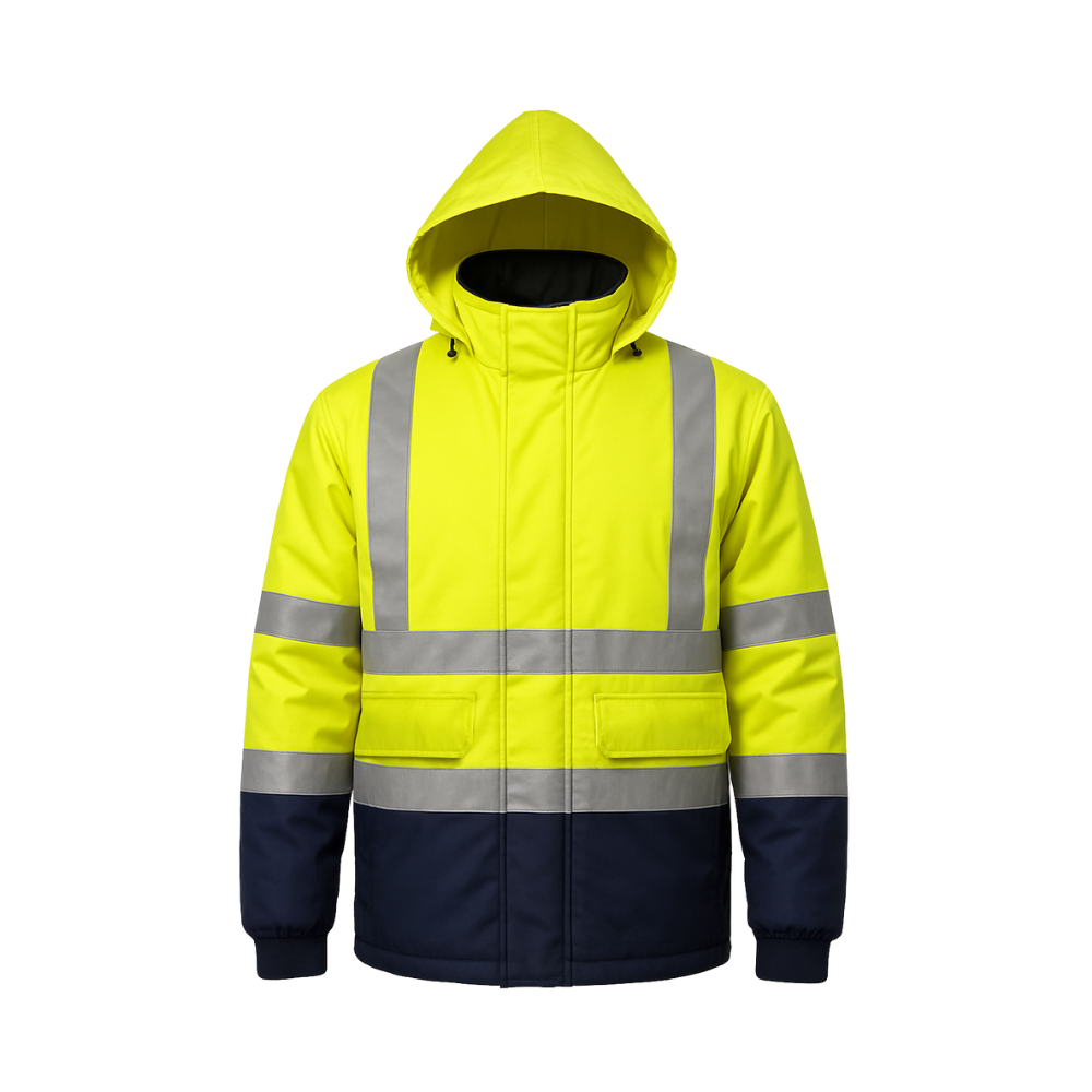 Campera térmica de alta visibilidad con cintas reflectivas termofusionadas, capucha desmontable y forreria matelaseada. Diseñada para jornadas en exteriores con baja temperatura y visibilidad reducida.