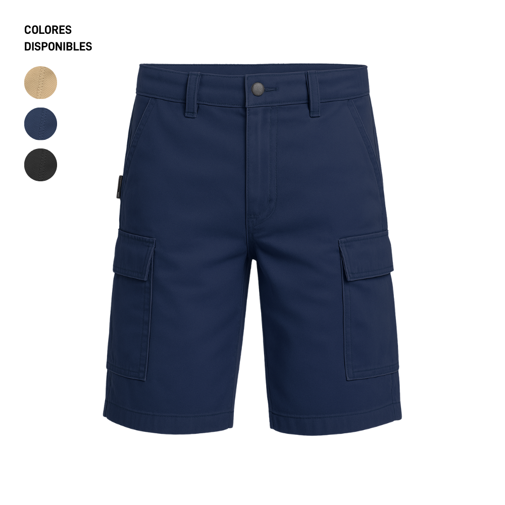 Bermuda cargo de trabajo confeccionada en gabardina elastizada (260gms.). Corte ergonómico, seis bolsillos funcionales y resistencia comprobada en climas cálidos.