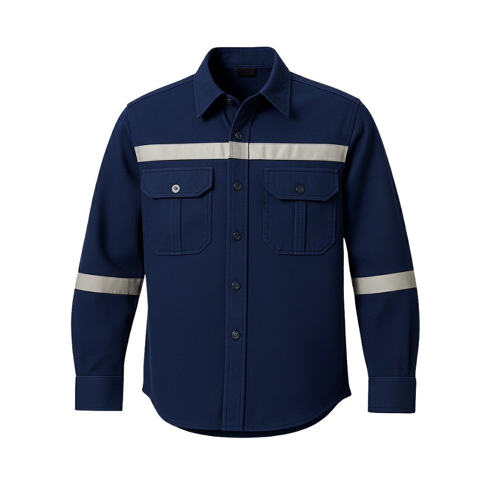 Camisa ignífuga regular fit con botones FR, bolsillos funcionales y cintas reflectivas. Ideal para entornos con riesgo térmico moderado. Certificado bajo estándares NFPA 2112 ATPV: 11 cal/cm² | CAT 2.