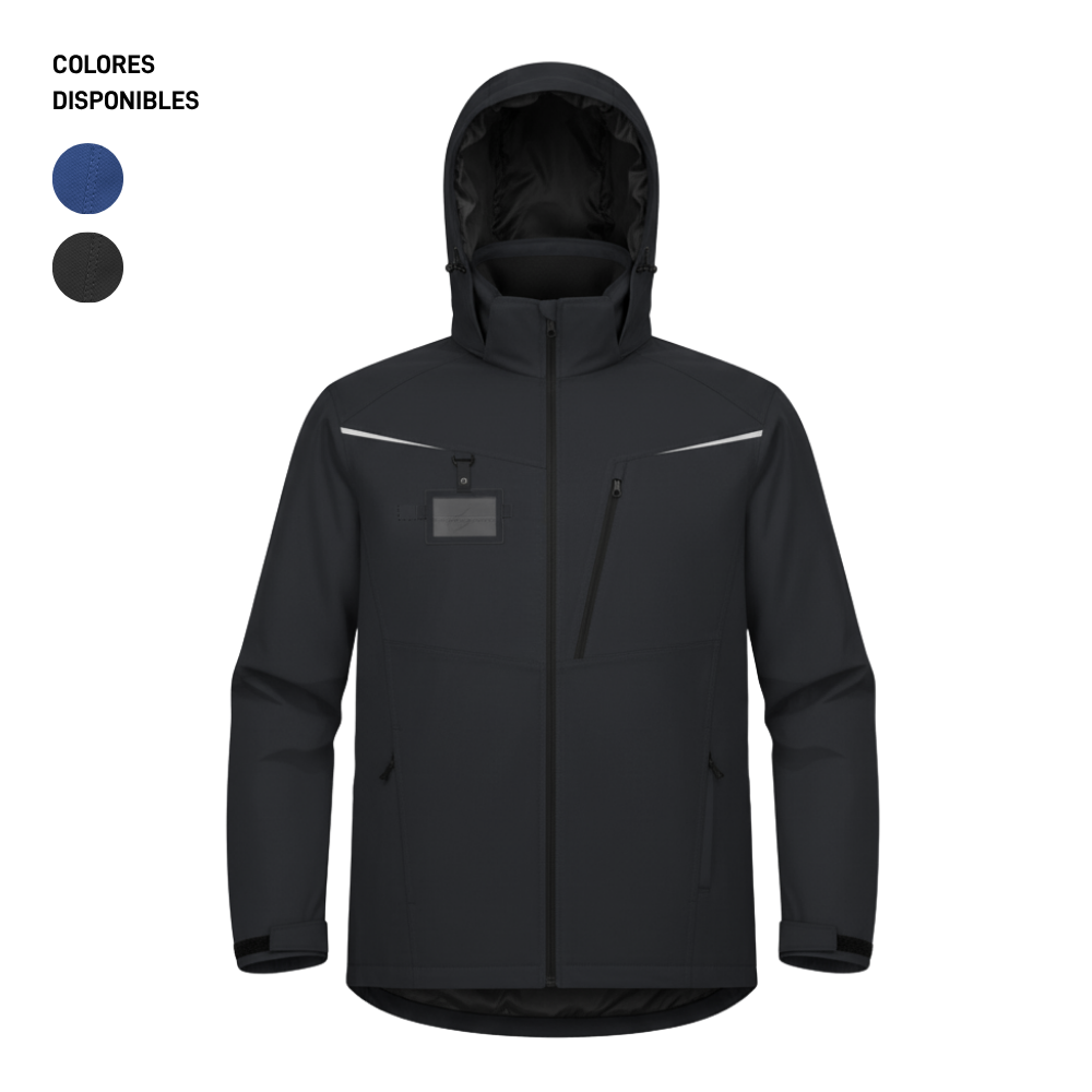 Campera térmica impermeable con capucha desmontable, costuras selladas y cierres estancos. Apta para condiciones climáticas severas. Certificada bajo CE, EN 343 y EN 342.